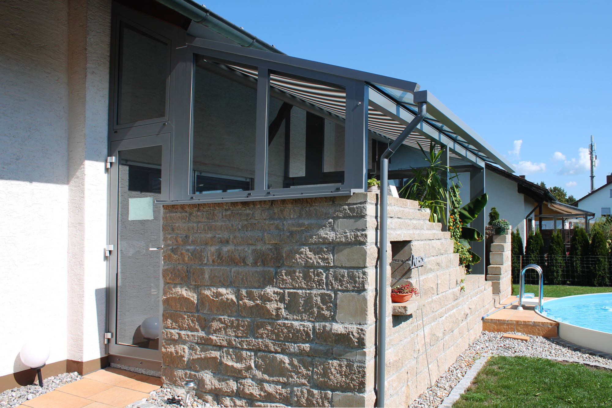 Sie möchten Ihre Terrasse auch bei Regen und Wind nutzen? Möchten Ihre Gartenmöbel bei jedem Wetter geschützt wissen? Entscheiden Sie sich doch für eine Terrassenüberdachung von Bauelemente Müller. Individuell auf Ihre Gegebenheiten angepasst planen wir Ihre hochwertige und attraktive Überdachung. Hier sind nahezu keine Grenzen gesetzt. Ob es ein einfaches Glasdach sein soll oder die Terrasse mit zusätzlichen Seitenteilen geschlossen wird – wir haben die geeignete Variante für Sie. Aus Aluminium und Glas wird Ihr Wunschobjekt gefertigt. Die Aluminiumprofile sind in allen RAL-Farben und in eloxierter Form erhältlich. Dadurch sind sie attraktiv an den Stil des übrigen Objektes anpassbar. Zudem gestalten sich die Profile besonders pflegeleicht, da sie nie mehr gestrichen werden müssen. Sehen Sie sich doch einfach einmal unsere Beispielbilder an. Bauelemente Müller hat schon unzählige Kundenwünsche realisiert. Technisch perfekt, meisterhaft verarbeitet und ganz auf Ihre Vorstellungen zugeschnitten – unvergessliche Stunden inklusive!