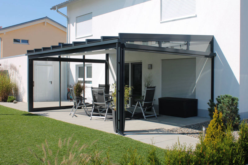 Sie möchten Ihre Terrasse auch bei Regen und Wind nutzen? Möchten Ihre Gartenmöbel bei jedem Wetter geschützt wissen? Entscheiden Sie sich doch für eine Terrassenüberdachung von Bauelemente Müller. Individuell auf Ihre Gegebenheiten angepasst planen wir Ihre hochwertige und attraktive Überdachung. Hier sind nahezu keine Grenzen gesetzt. Ob es ein einfaches Glasdach sein soll oder die Terrasse mit zusätzlichen Seitenteilen geschlossen wird – wir haben die geeignete Variante für Sie. Aus Aluminium und Glas wird Ihr Wunschobjekt gefertigt. Die Aluminiumprofile sind in allen RAL-Farben und in eloxierter Form erhältlich. Dadurch sind sie attraktiv an den Stil des übrigen Objektes anpassbar. Zudem gestalten sich die Profile besonders pflegeleicht, da sie nie mehr gestrichen werden müssen. Sehen Sie sich doch einfach einmal unsere Beispielbilder an. Bauelemente Müller hat schon unzählige Kundenwünsche realisiert. Technisch perfekt, meisterhaft verarbeitet und ganz auf Ihre Vorstellungen zugeschnitten – unvergessliche Stunden inklusive!